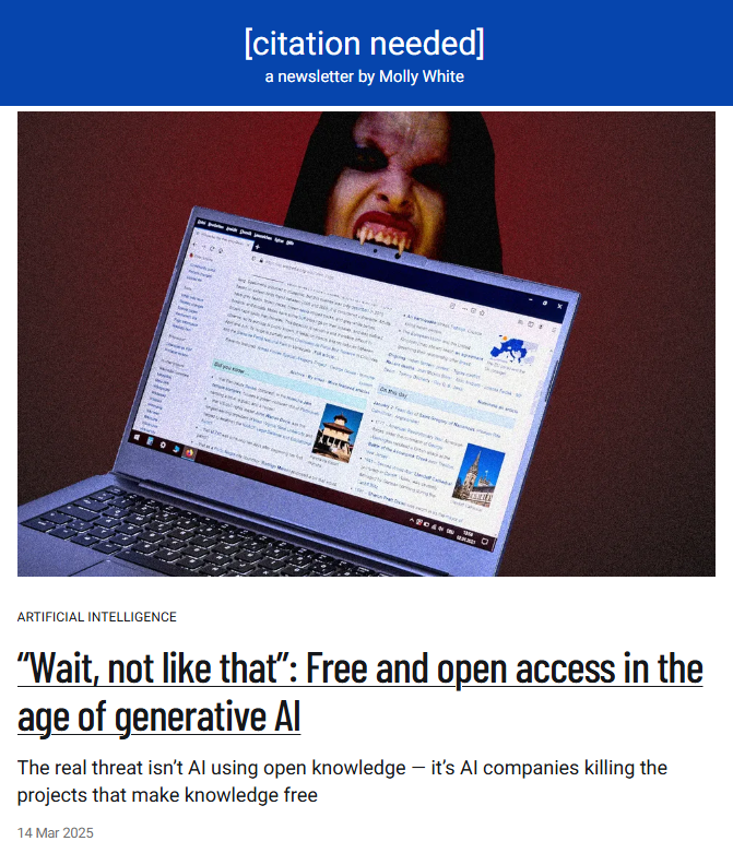 ![A screenshot of an article, "'Wait, not like that': Free and open access in the age of generative AI" with the byline "The real threat isn't AI using open knowledge -- it's AI companies killing the projects that make knowledge free." Posted with tag Artificial Intelligence on 14 March 2025 to [citation needed] a newsletter by Molly White. A thumbnail image shows a vampire biting a laptop with Wikipedia open on its display.](https://evieippolito.com/assets/5574945731021034383-unnamed.png)
